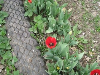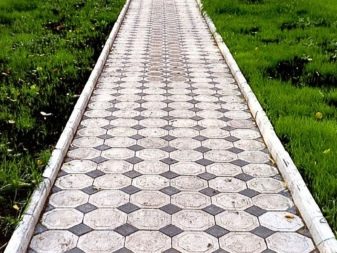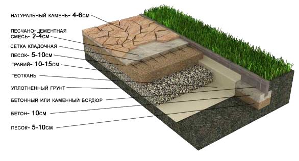 Next, take into account the drainage device. For continuous tracks on a cement base, a method of transverse slope from the middle to the edges is used to drain water.The middle is made somewhat higher, the finishing material is laid in an arc along the side edges. The slope must be at least 15 degrees. Paths with a more sparse laying of finishing material on the ground, sand or crushed stone have a natural drainage. At the device of a border laying of special storm systems under a roadway is necessary.