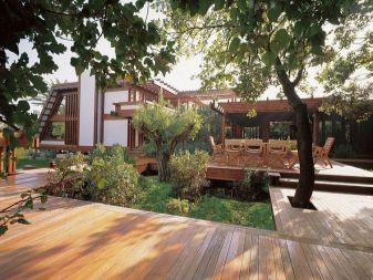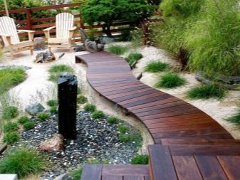 For pavements created a special garden wooden parquet - decking. For its manufacture, a tree of especially hard wood or plastic is used, imitating various types of wood parquet layout. Decking is produced in the form of plates or individual slats, which are laid out on a prepared base in a certain pattern. The sections have dimensions of 35 x 50 cm or 50 x 50 cm, due to special fastenings they are interconnected, they are placed on special supports.Such a connection allows you to simulate the track on the terrain of the site.