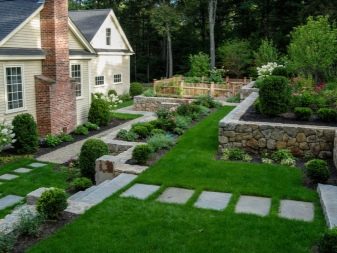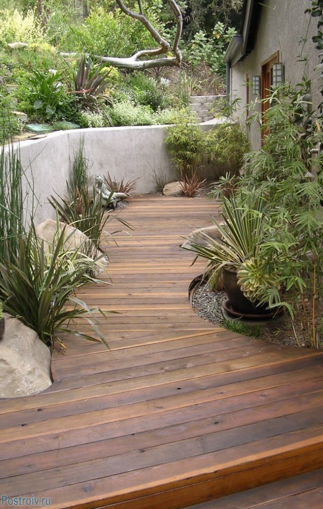 When planning walking routes, you need to ensure that the path does not rest on the fence. If this cannot be avoided, a false wicket, an arch with a bench, a flower bed are arranged at the end of the walkway. Do not be afraid of the relief on the site: the steps of large boulders or concrete sleepers give landscape design charm and charm. An important detail is the competent technological design steps: walk on them should be comfortable.