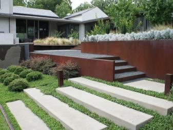 A prime example of a combination of a wide variety of materials is industrial hi-tech style in landscape design. Glass and metal, concrete and plastic, water and stone are combined here. These materials can be arranged randomly and symmetrically.The main thing is the presence of a clear geometric pattern. The tracks are strictly rectilinear, the turns have a strict pattern. The coating avoids texture, colors are discreet and monochrome. The most popular coatings of concrete and marble dumping with inclusions of glass elements, edged with metal. The water environment is originally presented in this tech design.