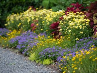 The use of color will add bright colors in the spring and autumn seasons. The use of material of one shade in the decoration of the canvas track allows you to create a monochrome garden. If it is planted with flowers of the same color, there will be a unique complex of plants and landscaping designs.