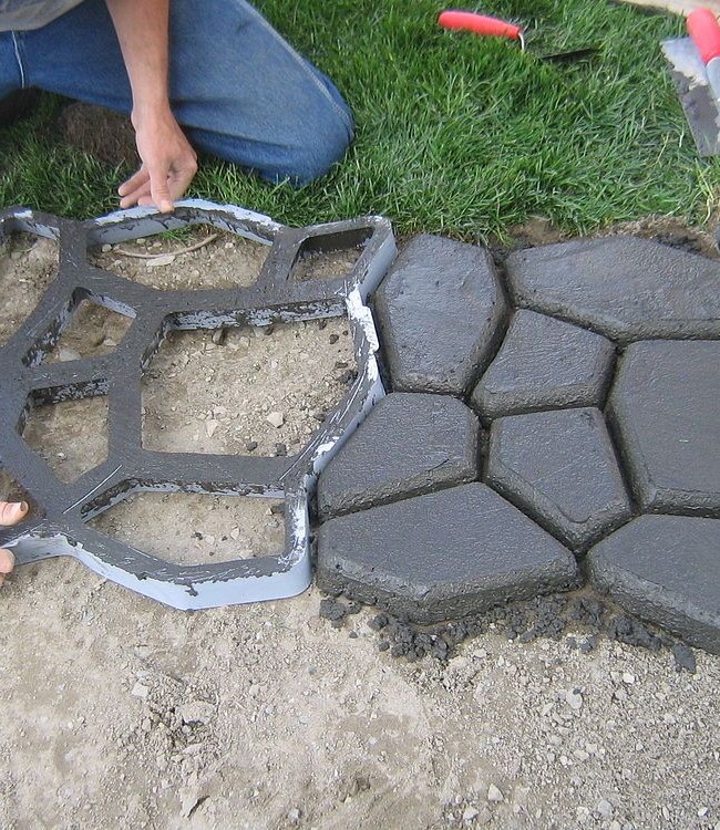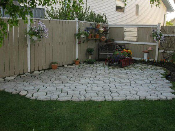 Hard pavement can be made independently of reinforced concrete. Prepare sand-crushed pillow. A metal grid is laid on it. Install the formwork and pour the cement-sand mixture. The top layer can be decorated with pieces of old ceramic tiles, fragments of dishes. Get a kind of colorful mosaic.