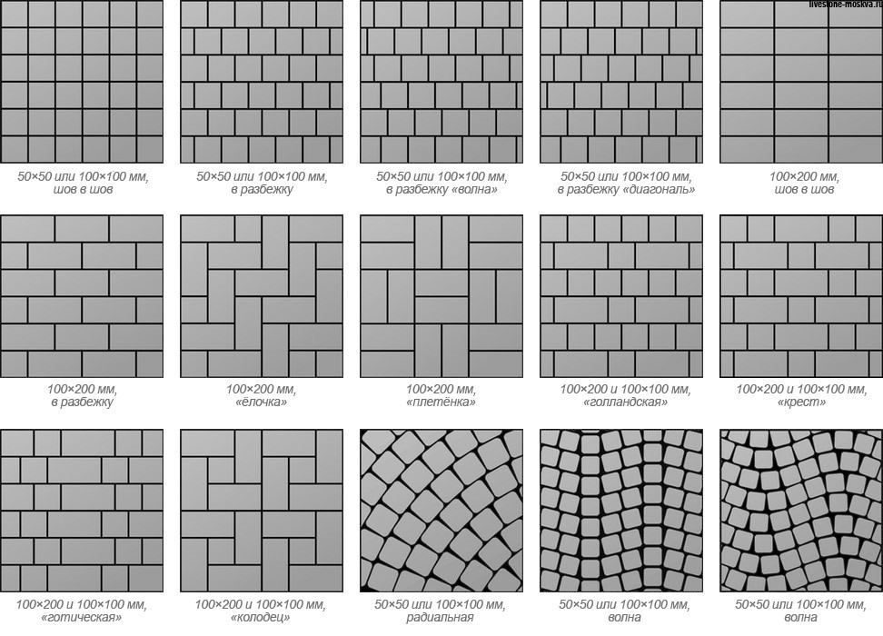 Stone can be laid "seam in the seam" or "in the run." In the first case, the edges of the ends are combined, in the second they are shifted by a certain amount. Layout "in the run" provides an interesting picture of the movement of the wave or diagonally. Apply alternation of longitudinal and end parts of the stone. This technique creates a "Gothic", "Dutch" laying, laying "well" or "cross." The most difficult is the "radial" laying. Its performance is best left to specialists.