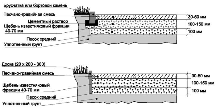 If necessary, install the curb, it is installed before the start of construction of the base for the track canvas. For dump tracks, the technology is simpler. Here you can use the option of laying on a concrete screed with a curb or on a sand-gravel mix. For narrow garden walking paths, a simplified version of the arrangement of paths made of brick, gravel, sand, concrete or paving slabs is used.