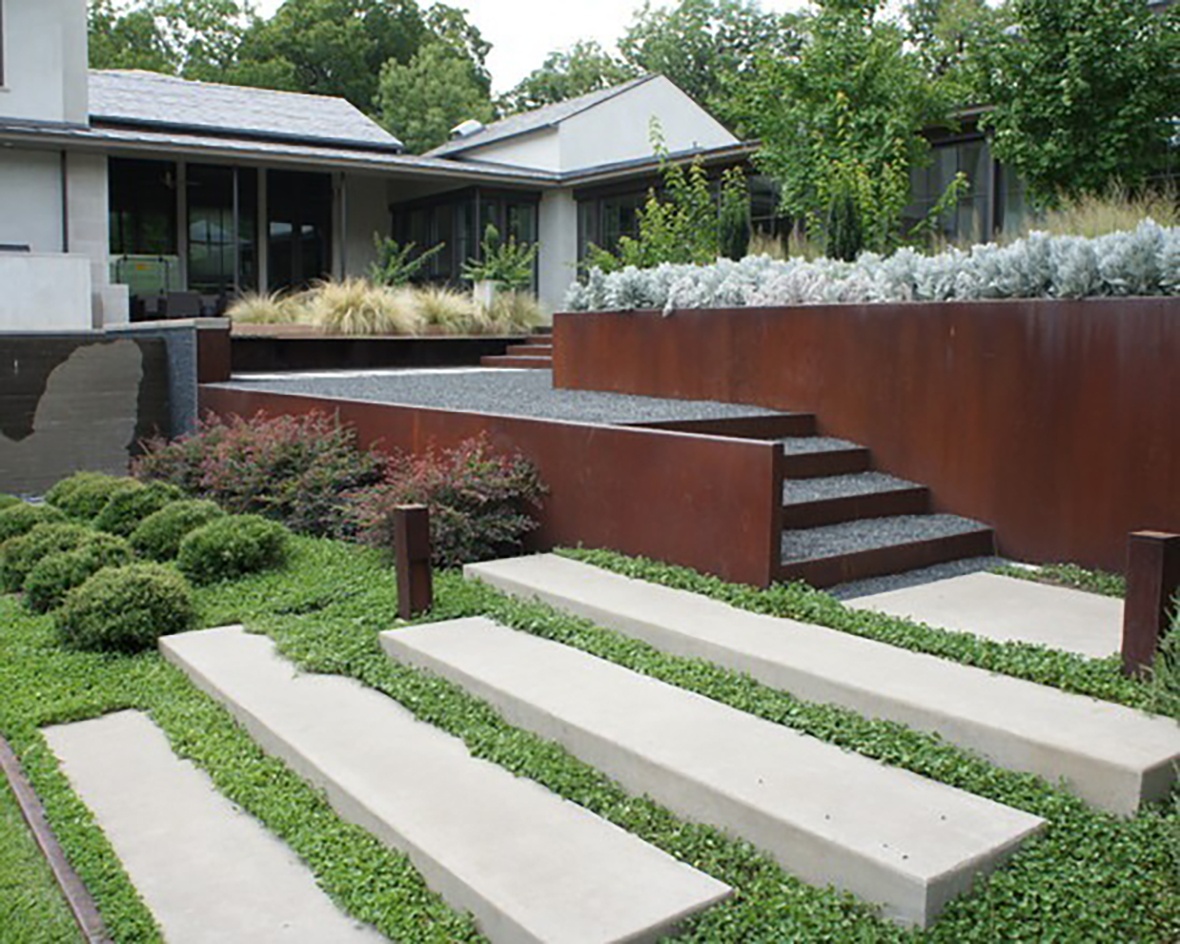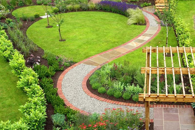 Paths can be a means of visually changing the parameters of the site. A narrow elongated area will look wider with a path in the form of a sinusoid across the area. In the short section, the coating material is better positioned along the track. This will visually lengthen the territory. The transverse layout of the material visually shortens the distance.