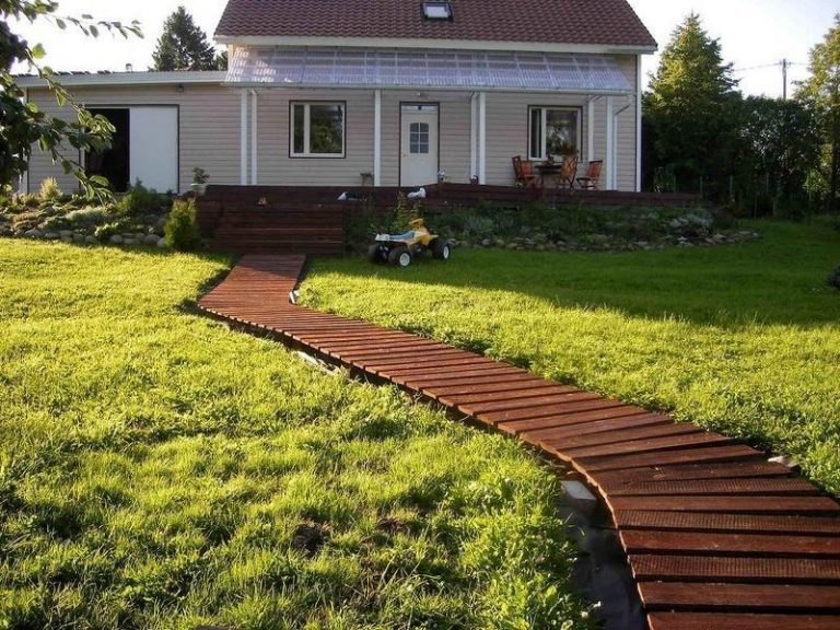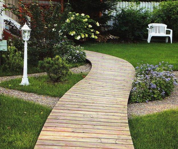 Traditional paths made of wood in the country - it is eco-friendly, inexpensive and beautiful. You can use the remains of boards or wooden pallets from the transport of building materials. The pallets are wide enough, the blocks consist of identical treated boards. They can be expanded along the course, but their lifespan will be short-lived, some boards may break and create a threat of injury. It is better to dismantle the pallets, make the preparation of a trench out of rubble or concrete, lay the boards on top of the logs, fix them with self-tapping screws and treat them with special means of decay.