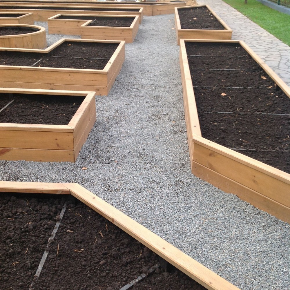 When arranging stationary high beds, the tracks are covered with rubblelaid on a black insulating material of acrylic. This material isolates them from the germination of weeds, while the moisture freely passes into the soil. Small gravel paths look aesthetically pleasing and serve for a long time. Different tracks in the country can be designed in the same style, using the same material, changing only the width and shape of the paths. It all depends on the preferences of the owners, the size of the site and the price segment of the landscape works.