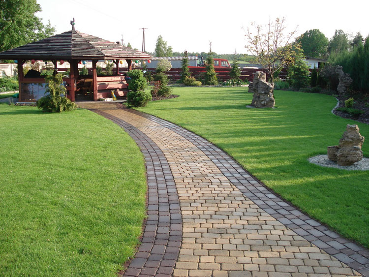 Walkways from paving slabs have universal purpose. Stacked on the cement-sand mixture, they will serve excellently on the main driveway, thanks to its high performance.