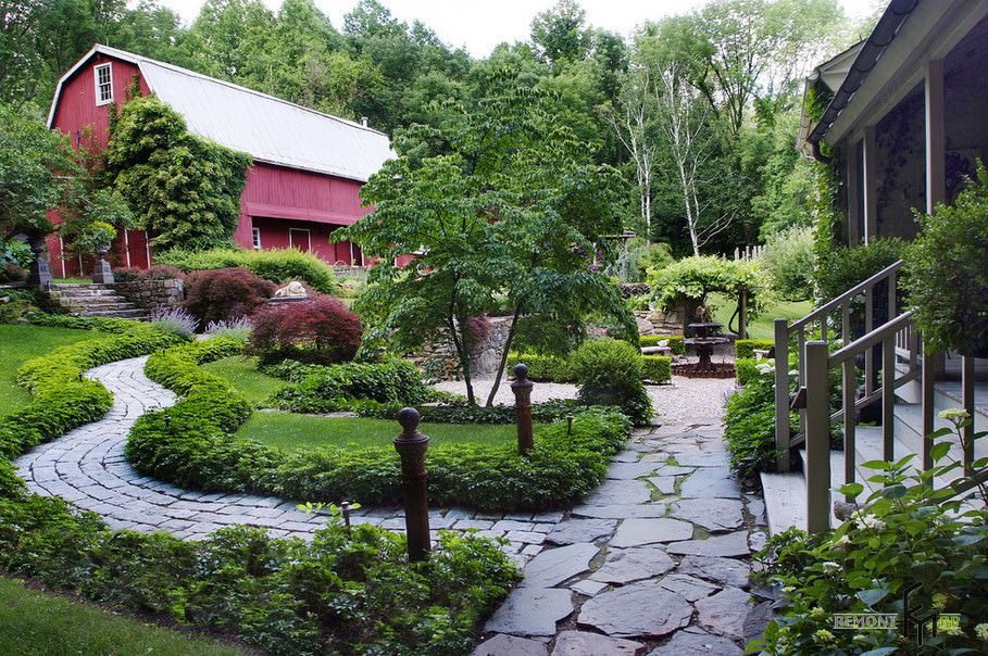 - Traditional country style with a log house or a sauna will complement the paths made of stone orcuts wood. These paths in the shade can be framed with hosts or ferns, in the sun with bright sage and lavender.