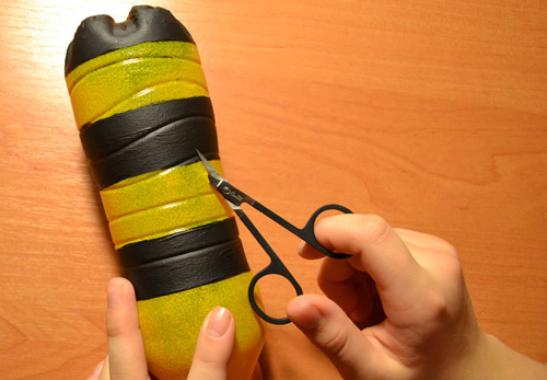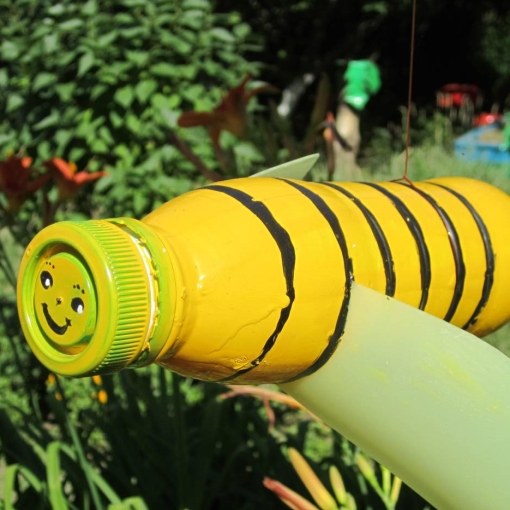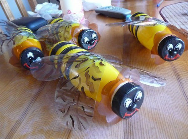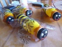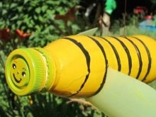 Applying bottles of small volume, you can create attractive bees, paint them with colored stripes. The antennae are made of wire with a bottle cap on the end.