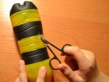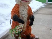 You can create an actual this year figure of a dog from improvised means. It is necessary to form the body of the animal foam. Then the construction is covered with a cloth, the ears, tail are stitched. From the packages cut by strips it is necessary to make makhry which would remind a fringe. Start from the back, moving towards the head of the product. Proceed leisurely to sheathing the foam frame of the doggie with this fringe. Then you should pay attention to details - sew a nose, eyes, decorate the dog with bows and a collar.