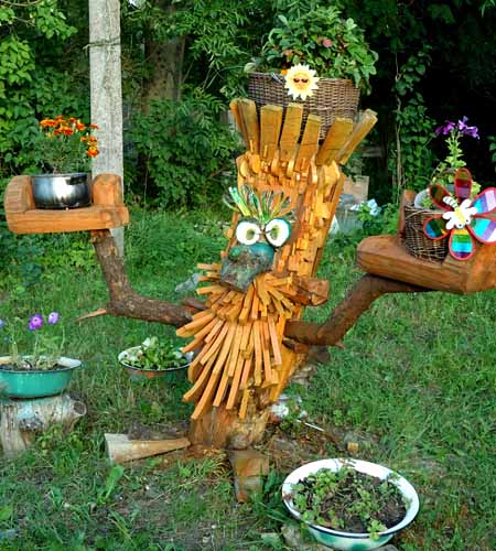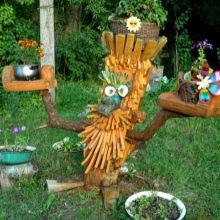 You are surrounded by a lot of scrap materials, from which you can independently make interesting and original products for the garden. The actual options are made of wood. For the embodiment of such figures is better to use raw material. These can be ordinary logs, twigs, snags. They will help you create creative wooden crafts, you just need to show imagination.