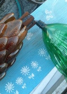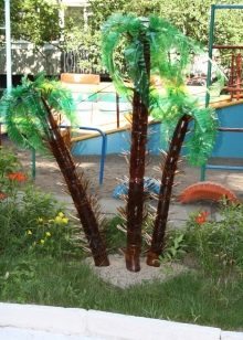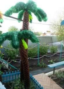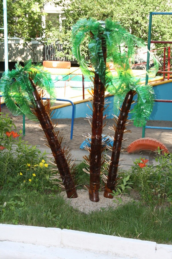 You can also create a palm tree from plastic bottles. Trim them and insert one bottle into another, creating a palm trunk. Upstairs you can attach lush leaves that are cut from green blanks.