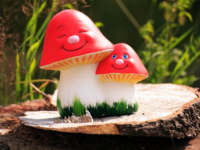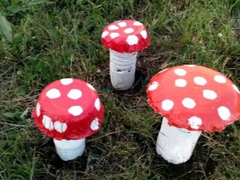 You can also create figurines in the form of mushrooms. They will look beautiful at their summer cottage. Products can be large or small, bulk or flat. The hat can be made separately and fastened on the leg with a solution of putty and screws. Paint the mushrooms worth acrylic paint.
