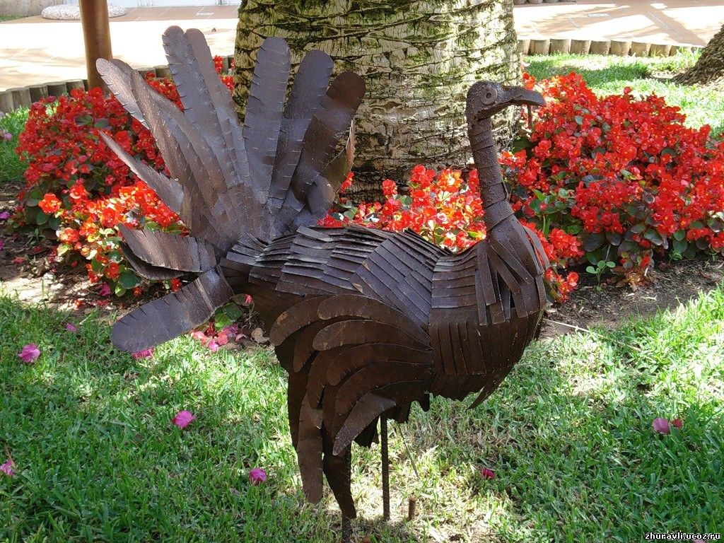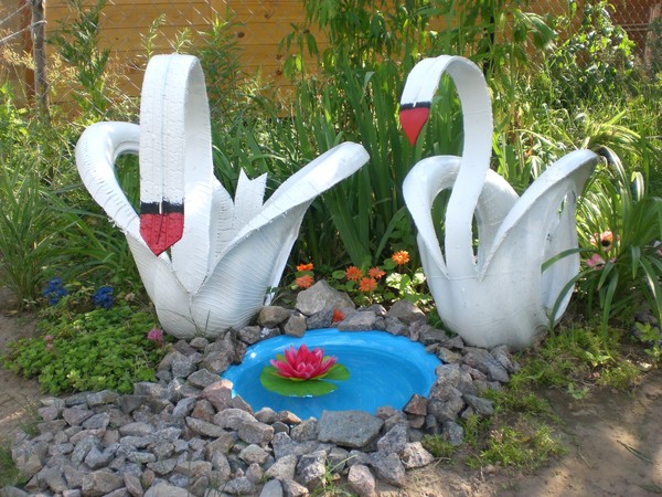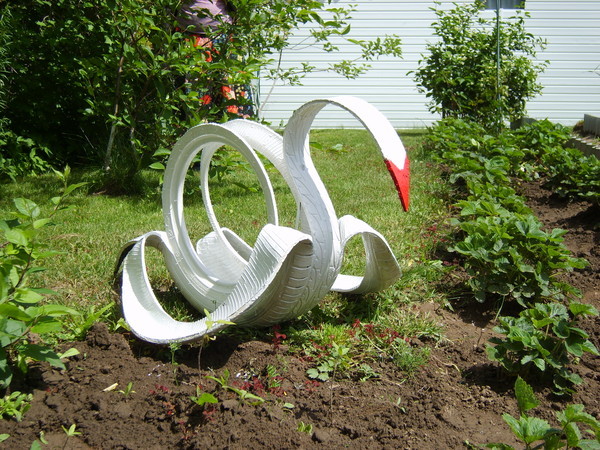 Similarly, you can create and swan. The tire is incised into three parts - the side and the center. Details will hold the form if they are stitched with metal wire. Fix the figure on the ground and paint it.