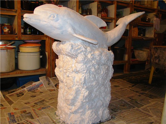 Products made of plaster are also common. Such material is particularly popular, as it helps to give shapes to any shape.But he has his drawbacks. The plaster figure is very fragile. It should be especially careful, being close to such decor. You can independently make a figure or use special forms.