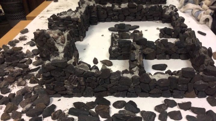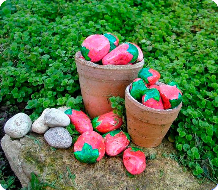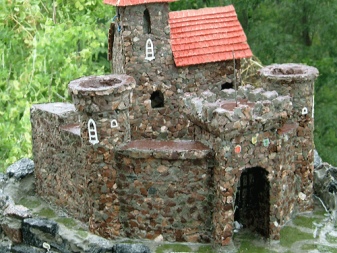 Then stones should be applied to each turret, using cement mortar as a binding material. The windows of the towers should be cut out of the bottle and cemented. Roofs need to overlay with broken tiles. If you “enclose” such a castle with a wall of stones, make an arch for the gate, you get a complete composition. To color the stones is an occupation, subject even to children. Using dyes that are resistant to moisture, paint the appropriate stones, lay them out of various forms on the beds or lawns.