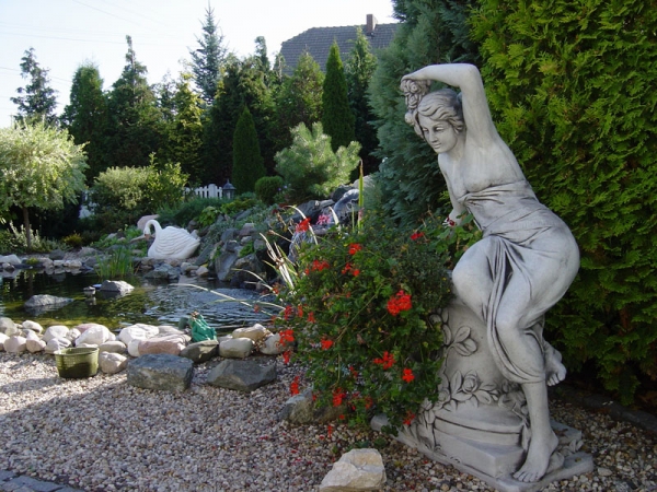 When placing garden sculptures it is important not to forget about the ratio of the dimensions of the figure itself and the area of the territory in which it will be located. Sculptures of impressive size are appropriate in a large garden, in a small area they will seem to be giants who have come to trample everything around. For small figures, the smallest green area will do.