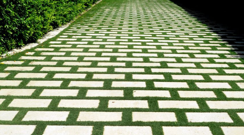 - laying paving slabs can be done in several ways. The laying of "Christmas tree" and staggered look effectively. For the design of a rustic style suitable chaotic placement of plates with clearly defined inter-tile gaps. Over time, grass begins to sprout through them, giving the track naturalness and freshness;