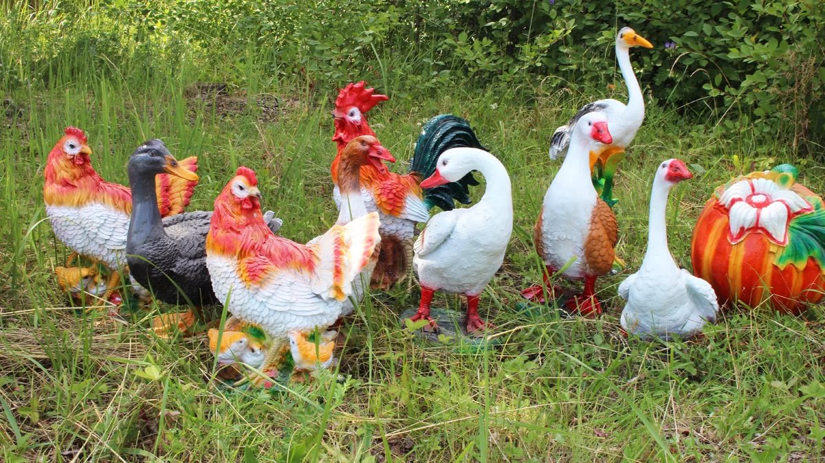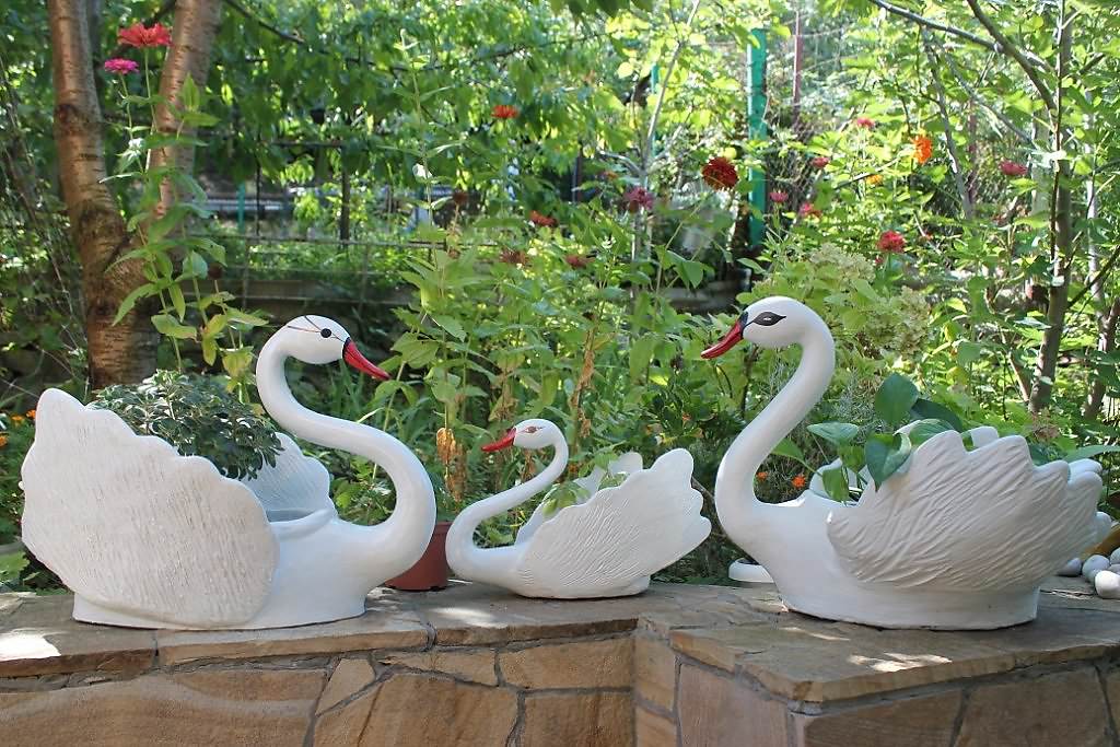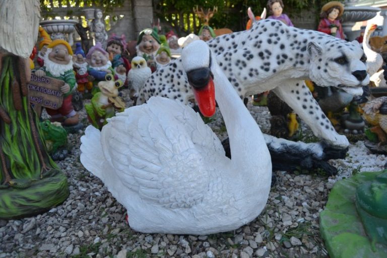 Animal figures are well suited for a country plot (some even choose products in full size). Popular options are dog, cow, donkey, horse. Many prefer wild animals and birds. A graceful deer in the garden will make you feel like in a fairytale forest; a beautiful swan by the reservoir will create a poetic mood. An interesting design option is a hanging head of a bear or other animal among the trees in the garden or right at the entrance to the house.