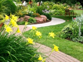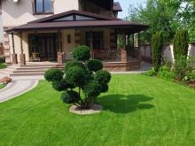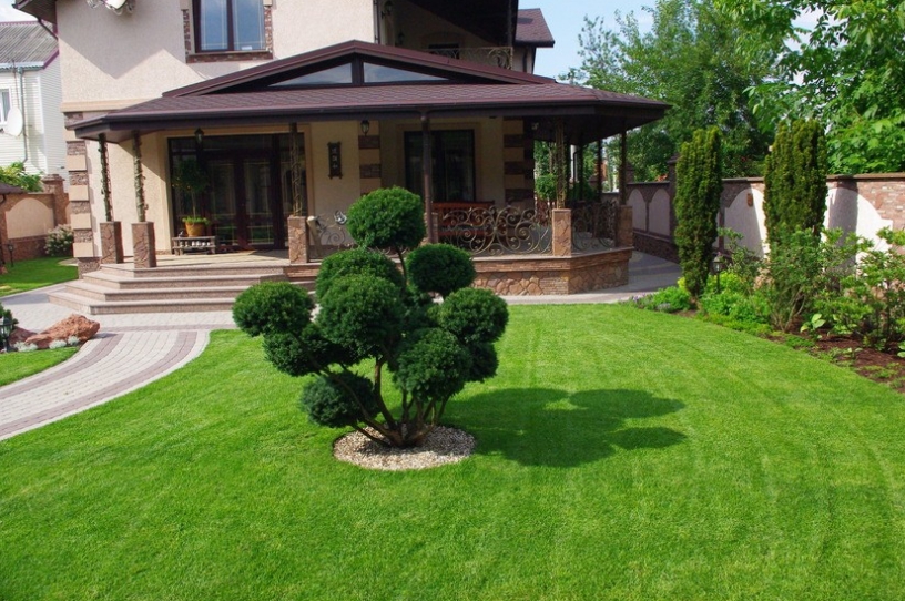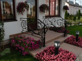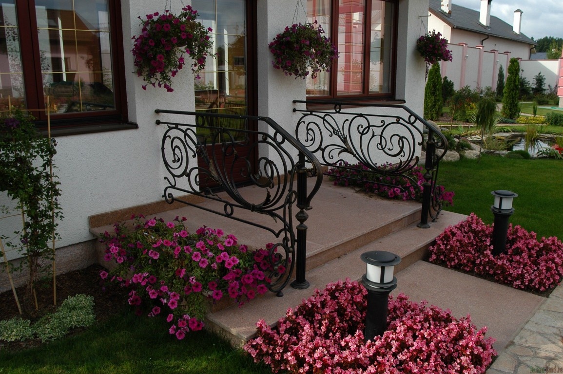 First of all, pay attention to the recreation area. Along the edges of the walkway that leads to the front door, flowering plants can be matched in style. If you like colorful, you can choose this option, but It is recommended to consult with a florist who will give useful advice and provide professional assistance.