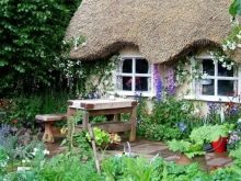 - for fans of the western way of life design suitable country, which originated in America. The garden can be somewhat casual, but definitely cozy. Lush flower gardens prevail, due to which weeds will be lost on the plot. The list of plants can include unpretentious herbs, dandelions and daisies. The materials used in the landscape must be exclusively natural, it is wood and stone;