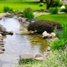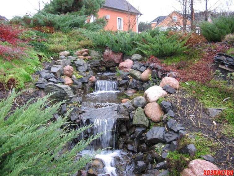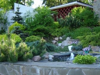 An alternative to rock garden - artificial stream, which is easy to "start up" on the slope, trimming it with stone. Also on the slope are well placed stairs, benches of non-trivial forms.