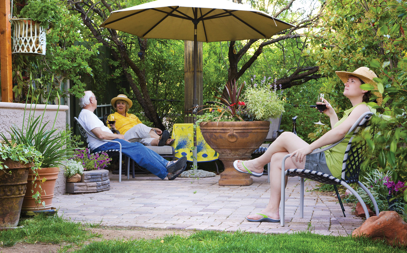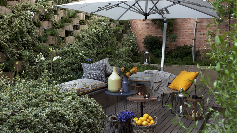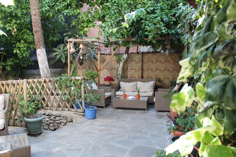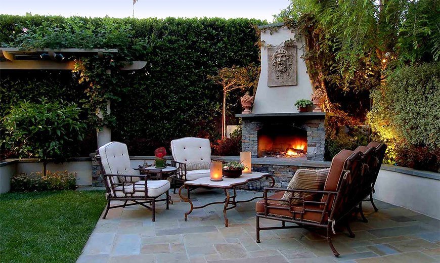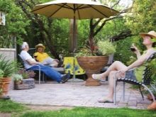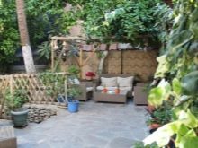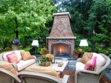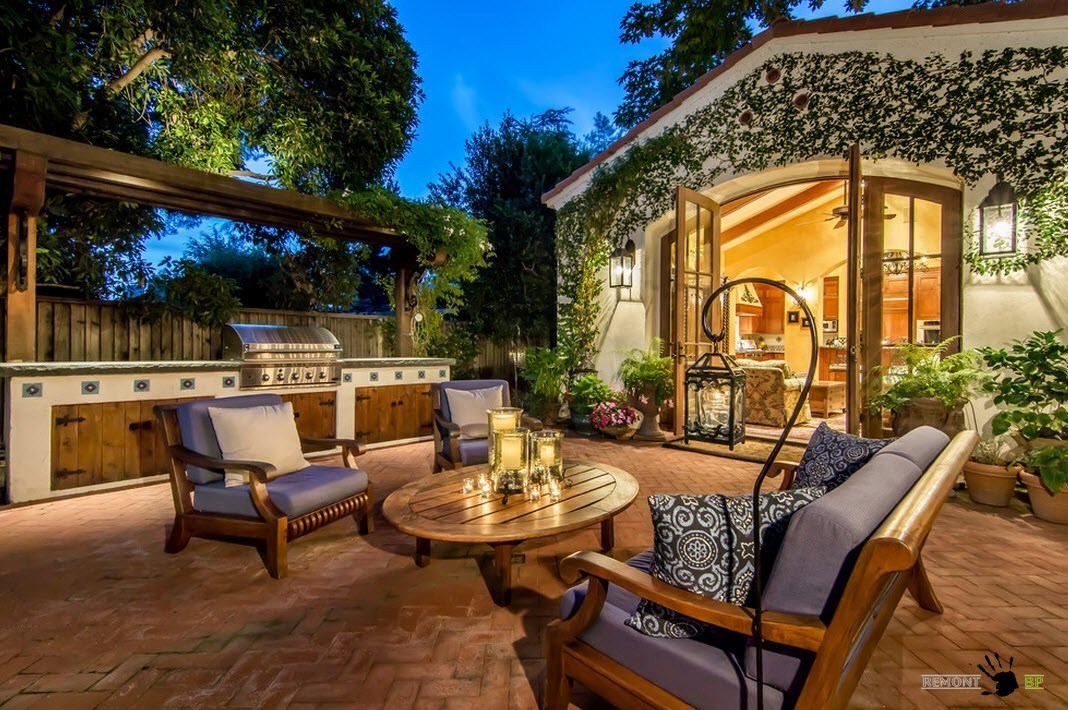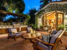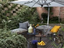 - Patio. One of the currently fashionable ways to arrange a recreation area in the country is the arrangement of a small closed "courtyard" inside the courtyard. As a rule, it has a transparent roof and has no walls, so it cannot be counted as either open or closed types. Inside the patio it is convenient to place potted plants and tubs with flowers, decorative elements in the form of lanterns, a furniture group. Chairs with textile covers made of natural materials, wooden and wicker chairs, round tables fit perfectly.