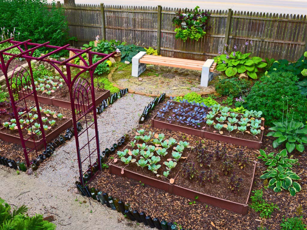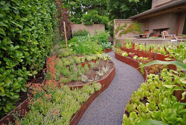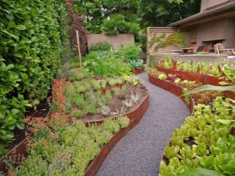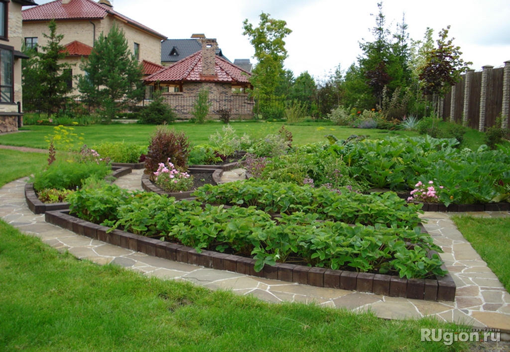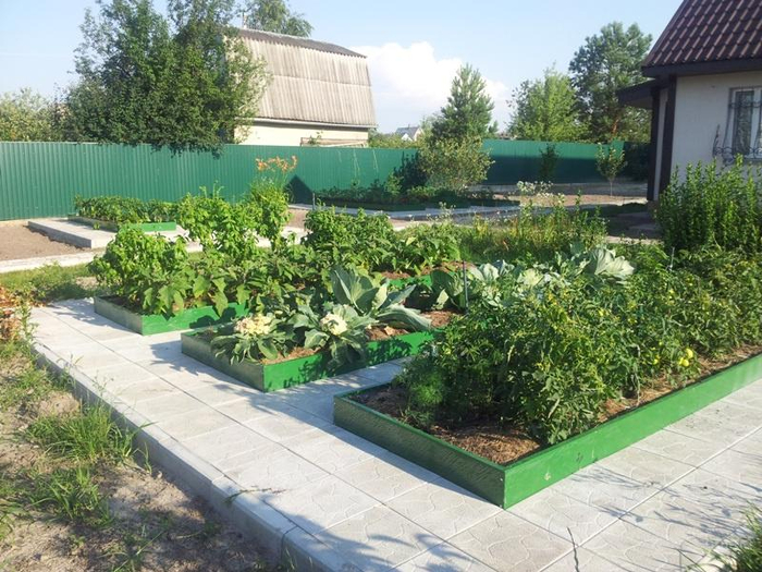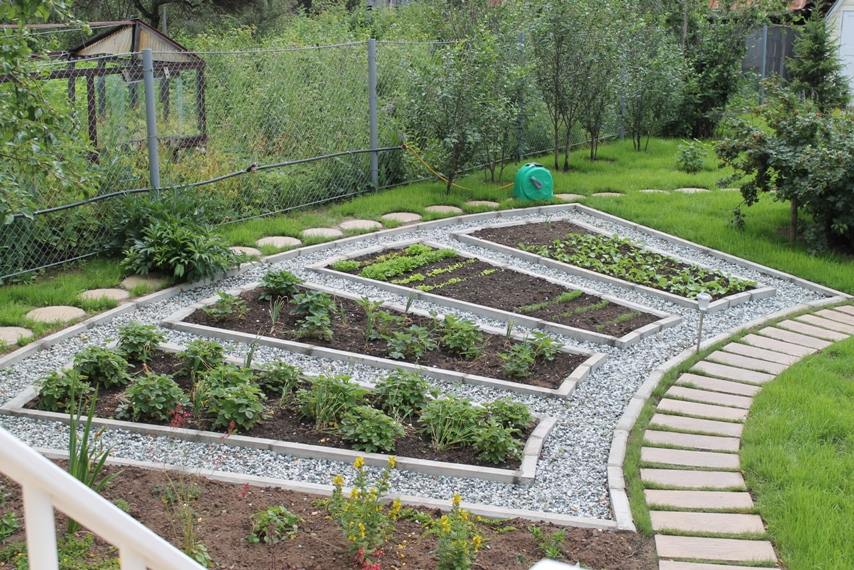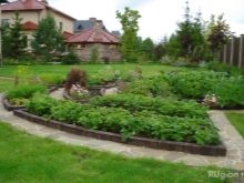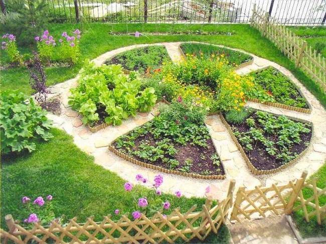 This is the largest and most illuminated area of the site. In addition to practical benefits (harvest, vitamins, seeds), it can also carry a decorative function. For this, beds are made of irregular shape, framed with borders, combined with floral plantings.