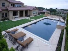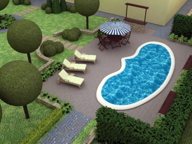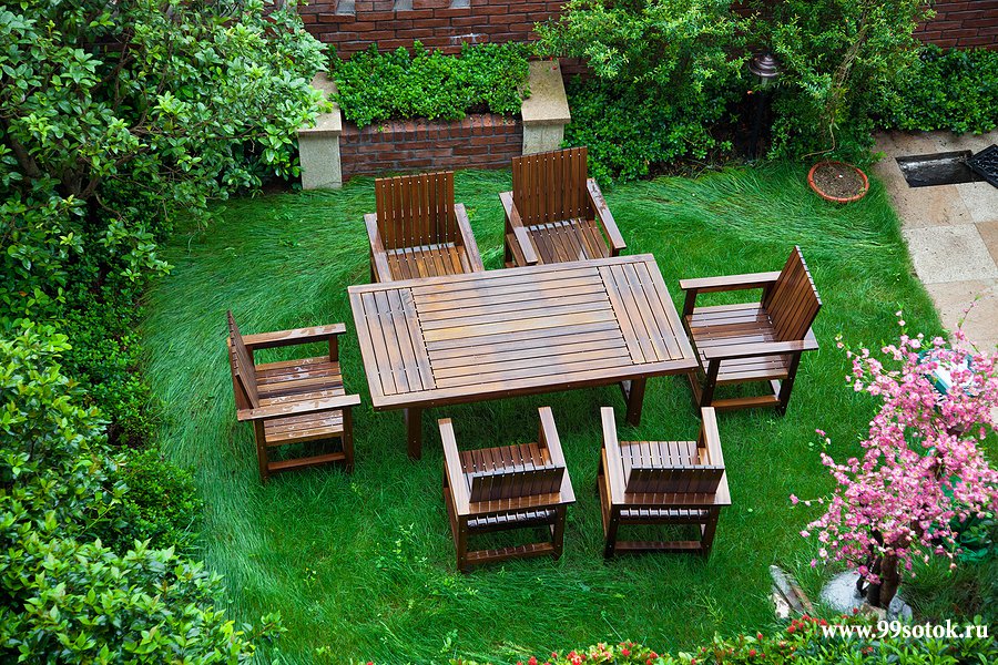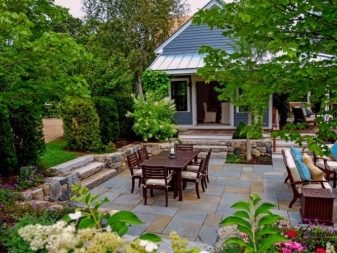 A large outdoor area may include a playground, a table for playing tennis or a volleyball net, a swimming pool, exercise equipment, and lounge chairs.It is convenient to place the latter in a small area, because they are easy to fold and remove, if necessary, to free up space.