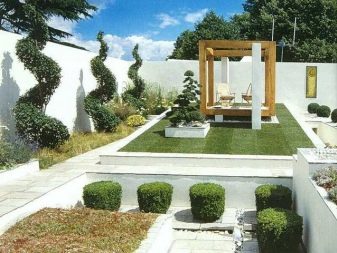 - Modern. This style implies absolutely any design idea, be it minimalism or a riot of colors and textures. The combination of green spaces with small architectural forms of a non-trivial type is widespread: wooden, plaster, metal objects.