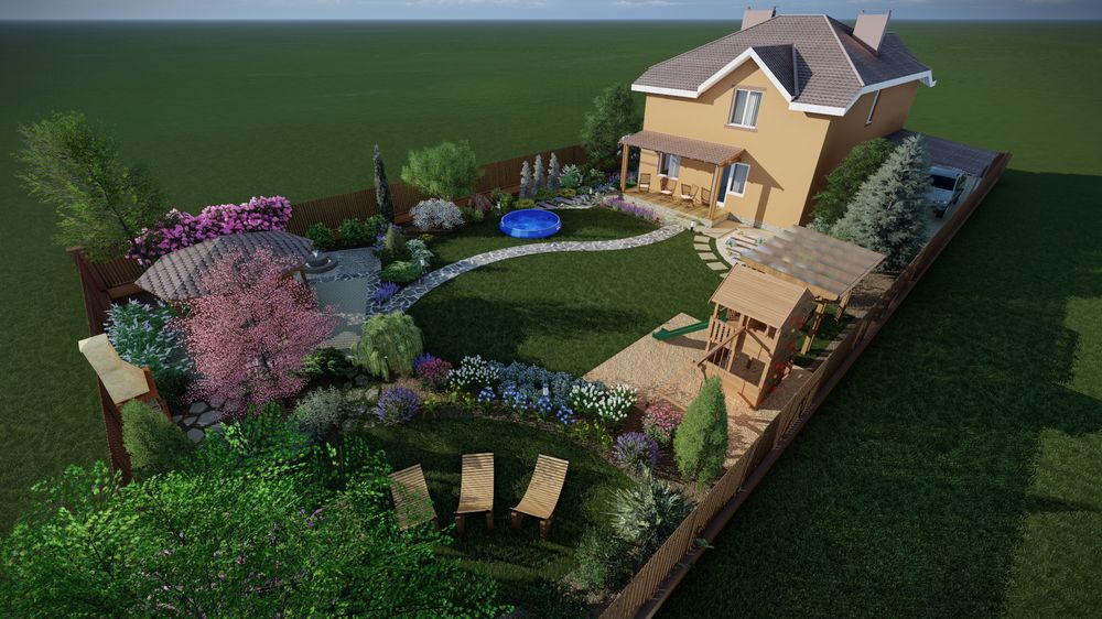 It is even easier to refine a large plot, because it can accommodate beautiful flowering beds, fruit trees, a recreation area, and a large house with gazebos and a terrace. There is a place even for the pool and guest house.