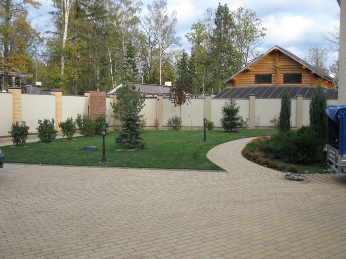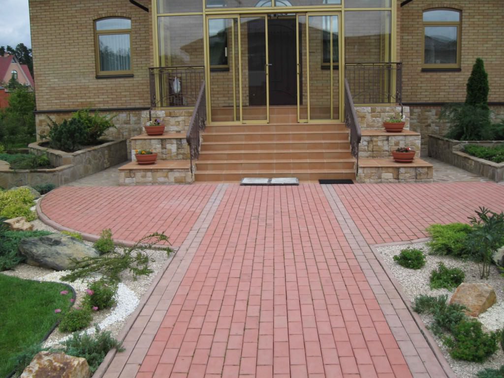 When arranging the road, it is important to consider that water should not stand on it. It is necessary to organize outlets and drains.. There is also a large load on the transit zone, so it is recommended to choose wear-resistant materials for finishing. The path can be asphalt or stone tiles. Areas free of the walkway can be decorated with greenery, but not fruit varieties. Shrubs and flowering beds will do.