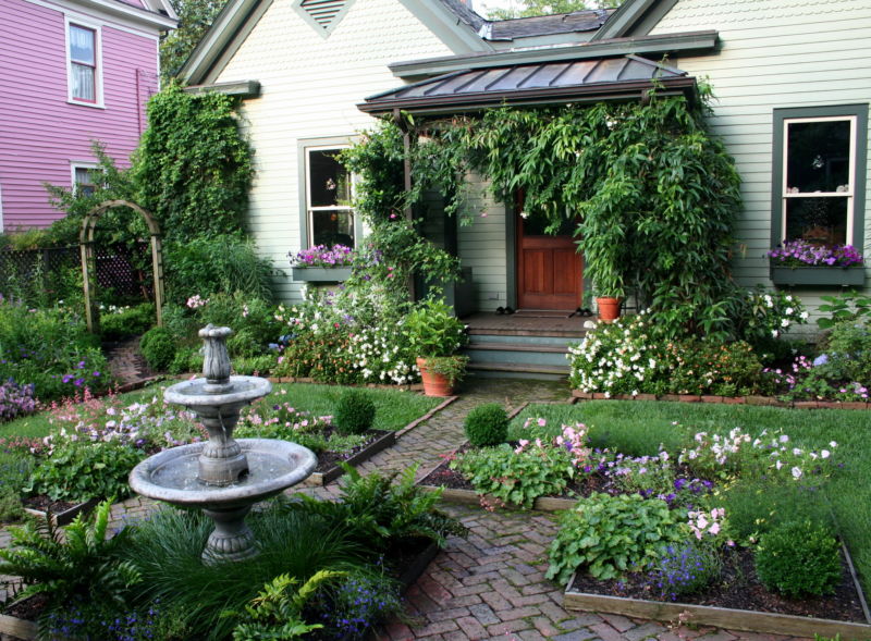 - Bright accents on different sides of the plot. It can be a bench, a fountain, an unusual tree or another bright element that will pull attention to itself, “breaking” a straight line at the border of the site.