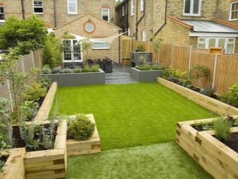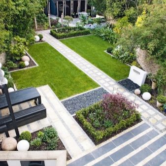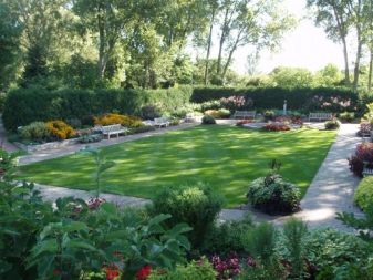 On a flat section of a rectangular shape, the division into zones made in the form of geometric shapes will look good. The stretched area is better divided into two equal parts due to a hedge or flowering beds. In the corners of the garden, where there is always a shadow, you can build recreation areas with benches.
