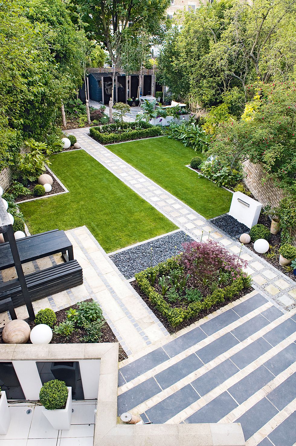 According to this design method, the lines should have an angle of 45º relative to the fence enclosing the garden, or to the wall of the house.