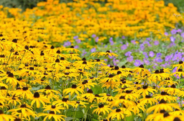 Rudbeckia is also often found in country beds. Large bright yellow and orange flowers, resembling a large chamomile, will be a wonderful decoration of any area. Rudbeckia looks good in the background of the flower garden, perfectly harmonizes with coniferous plants. Especially popular in the design of rockeries and home lawns.
