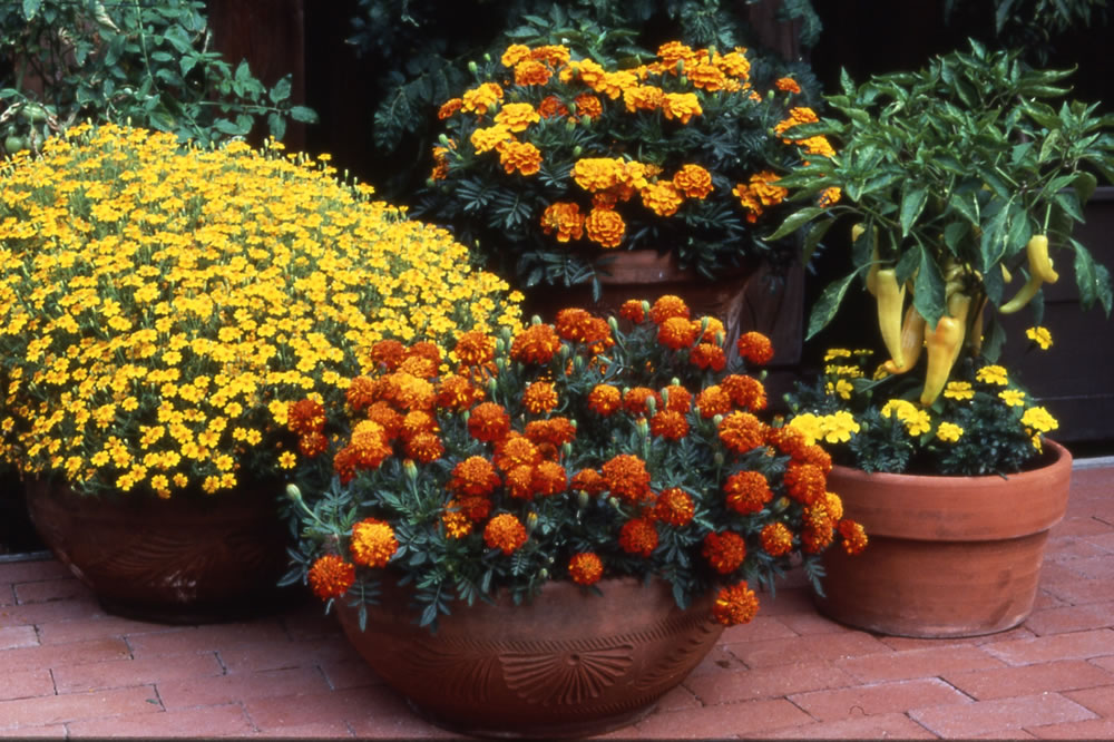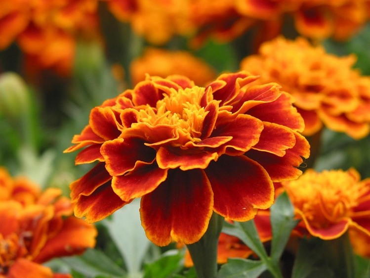 Based on the shape of the flower head, marigolds are simple, clove-colored, chrysanthemum, double and semi-double. They have a characteristic aroma and grow only 15-20 cm in height. Picturesque flower carpet of marigolds will delight you with a delightful bloom all autumn. Hybrid marigold varieties are especially popular with gardeners.