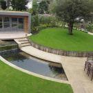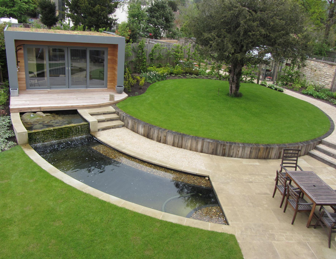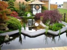 - Decorative pond - It can be of different types: with a fountain, a waterfall, a pond, as in Japanese mini-gardens. He always becomes a decoration of the landscape. Water attracts the eye and distracts attention from the size of the garden, which is beneficial for small areas. The pond itself is usually lined with natural stone.