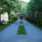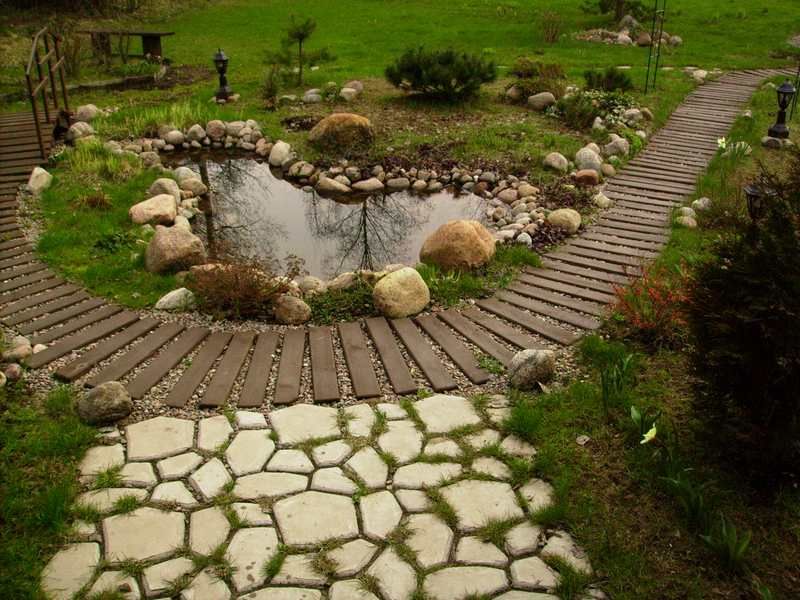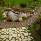 - Tracks - There are quite a lot of materials on the construction market for their production, the choice is in the style and fantasy of the designer.In addition to the usual tiles, stone, shell, you can use slices of logs and other natural materials. In large gardens look good smooth symmetrical paths. In small areas, the paths should wagging between trees and flower gardens, disappear into the bushes, allowing the imagination to imagine that there is a large garden behind the bushes.