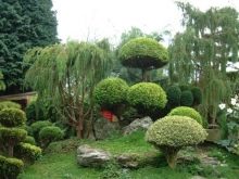 Trees from 1 to 7 meters are usually used, variations with plants of different heights look spectacular. For the right visual perception, higher trees are set aside; low planting material is placed closer. Contemplation plot begins with the gate. Trees can grow alone or be combined into decorative groups.