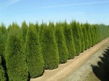 - Thuja Many favorite plant. It looks great in the compositions with any trees and shrubs, may be the main component in the design plan. Well forms a fence.