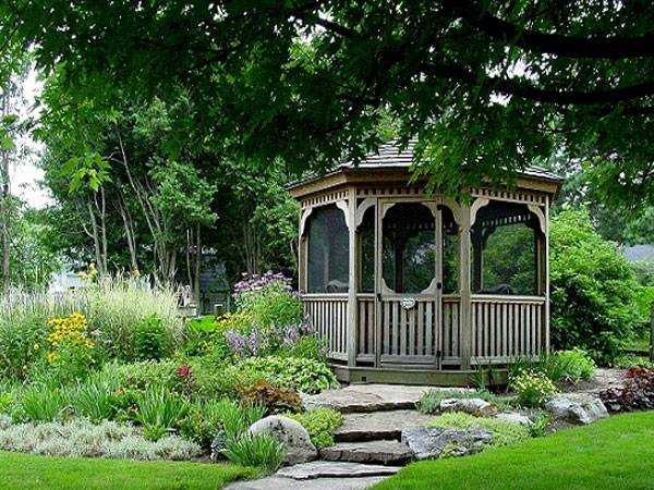 - Gazebo, terrace - with walls, with a roof, or without them, anyway they are favorite buildings for summer holidays. They can be surrounded by green grapes or draped with a mosquito net, equipped with a stove, barbecue and other picnic devices.