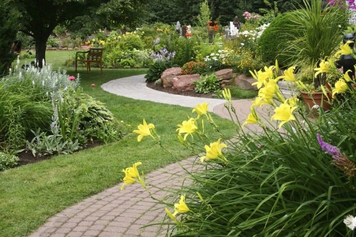 - Free flower beds are flush with the ground. They have hidden frames that do not allow flowers to grow over the area. They are thoughtfully distributed over the territory between the compositions of trees and shrubs, buildings and garden decor.