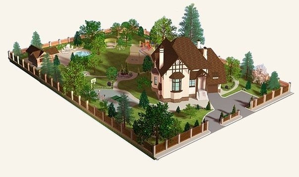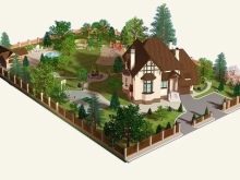 It remains to build a bath in the plan (you can not far from the fence and at home). Garage and playground is better to dissolve in two directions, so that children play away from the car. The most functional solution is to build a garage under the house: in the rain in the car it will be more convenient to sit without traveling along wet paths and lawns. Arbor remained. Here all wishes: you can bring them closer to the house, or to postpone. Braid gazebos with roses or clematis: this will create a romantic aura. Thin natures will like the small artificial lake near the gazebo.