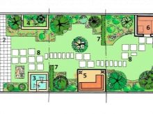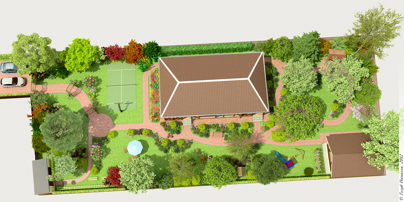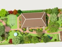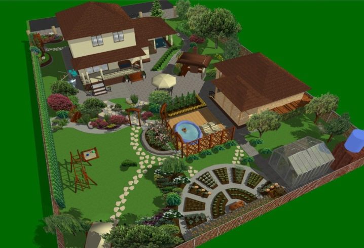 Features of creating comfort on such a site are to have a clear project of the area in advance. Draw on a sheet of paper all the buildings and landings as if you see them on top. On the plan, indicate the main building, pool, barbecue area, gazebo, a place for a hammock, a playground, flower beds, garden beds, garden alleys, paths. Equip your drawing with an indication of the sides of the world: this is important in order to understand the coverage of the territory.