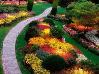 Flowerbeds and slides perform an oval shape. The tracks wind and even go serpentine. Plants are planted in arbitrary variation, different in height and saturation of the inflorescences. Small ponds, retro-style benches, wrought-iron wickets, and overgrown pavilions fit organically into these secluded corners.