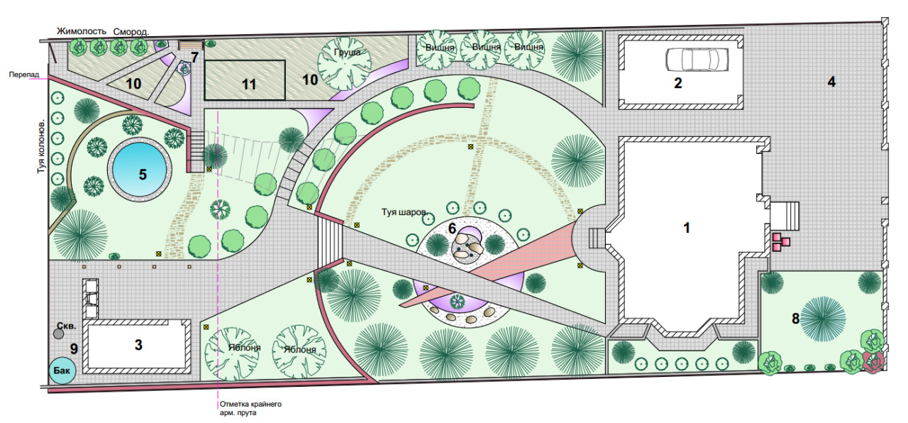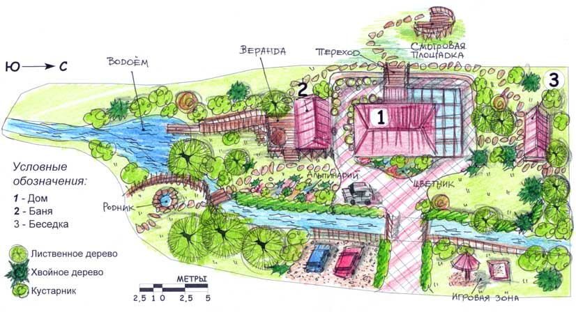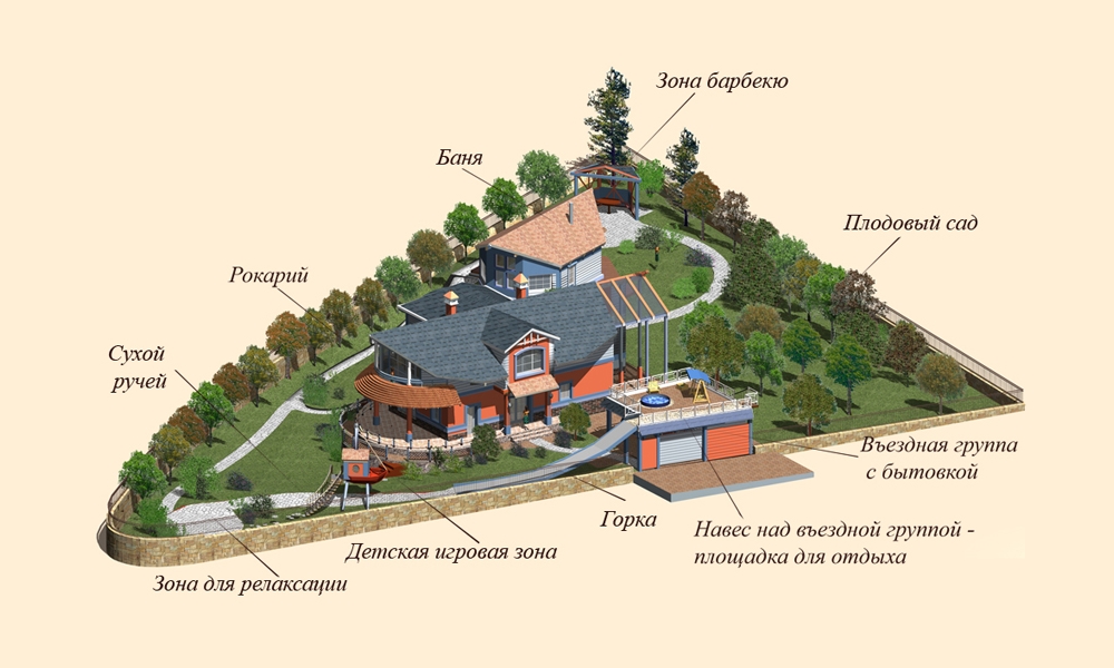 Analyze where you have sources of water. From this depend on the garden and vegetable garden. It is not necessary to plan a playground in the neighborhood, and then the kids will have to mess around in the mud.