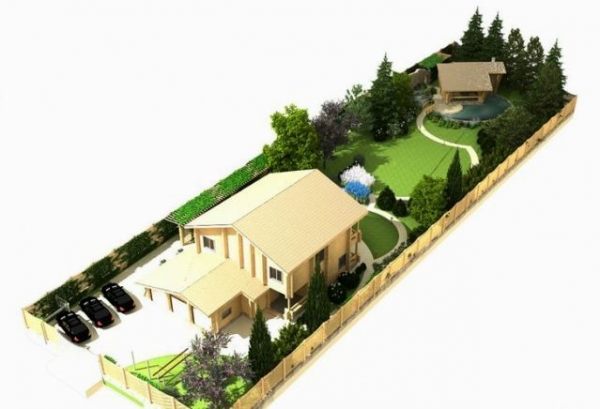 If the site is narrow and long (for example, 30 x 50 m), it is necessary to take into account not only the size, but also the shape, because the ensemble, which will emphasize the good taste of the owners, is required to achieve in any case. Experts believe that here the most large-scale areas should be placed on the sides of the site. For example, on the one hand there is a garden, and on the other - a playground for recreation.