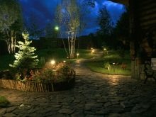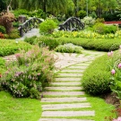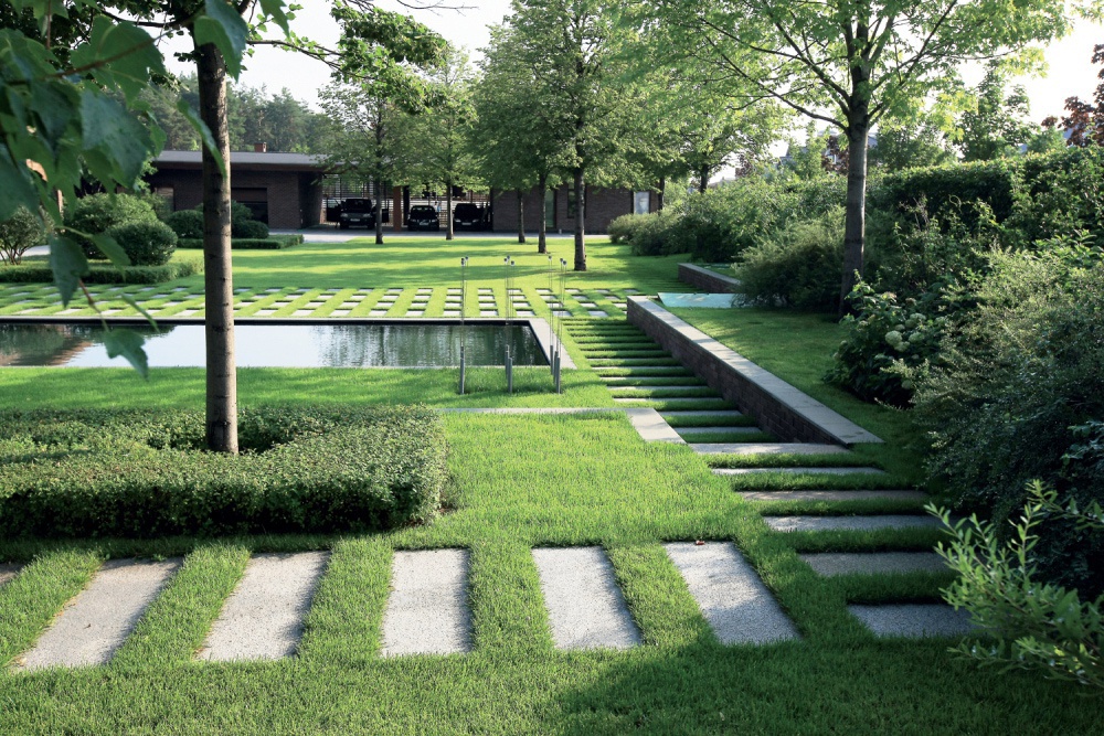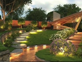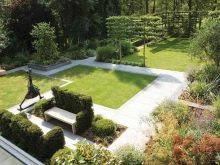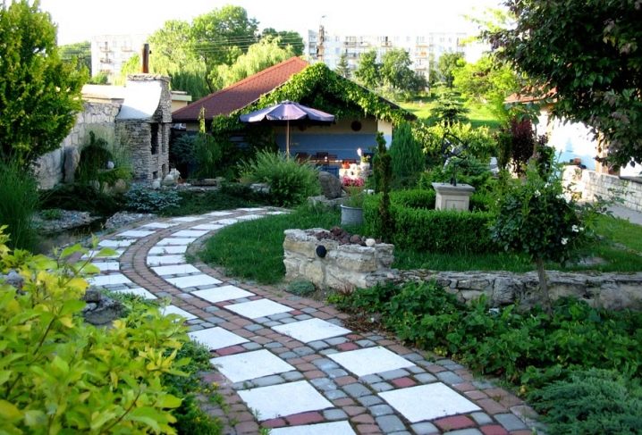 A large role in decorating the backyard territory is assigned to the paths. The material of their manufacture in a small area of 6 acres becomes the main element of landscape design. Paths of country-style gardens are made of stone, bricks, and wood sawn off. For the Mediterranean style fine gravel, pebbles, sand are suitable. Classic is a natural limestone, clinker bricks or paving slabs. Modern high-tech landscape styles hi-tech, minimalism are made out of glass, concrete, floorboard.